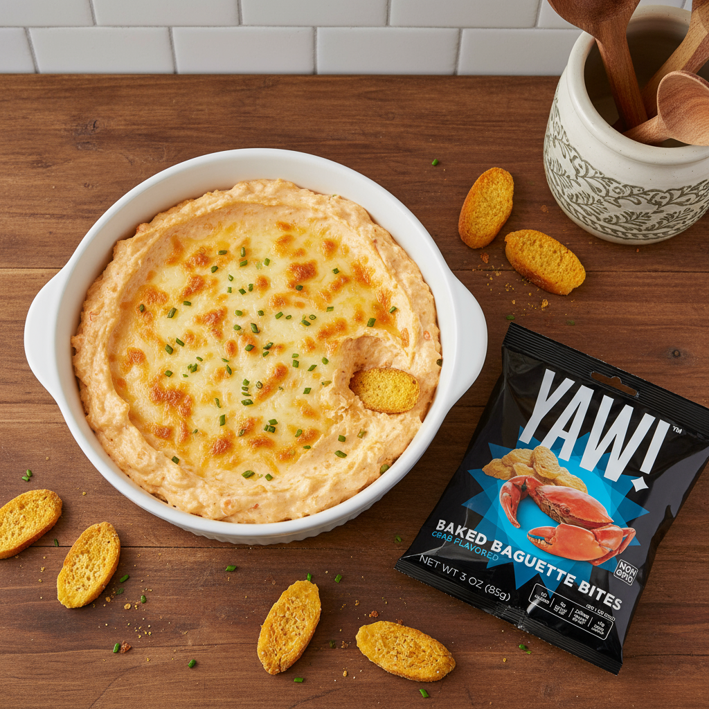 This Crunchy YAW! Crab Baked Baguette Dip is creamy, cheesy, and packed with savory crab flavor. Topped with extra YAW! Bites, it’s a quick, irresistible appetizer, perfect for parties or when you’re in a pinch!